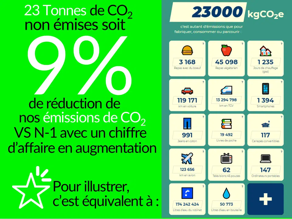 23 Tonnes de CO2 non émises soit 9% de réduction de nos émissions de CO2 par-rapport à l’année précédente, avec un chiffre d’affaire en augmentation, grâce à des actions concrètes :
