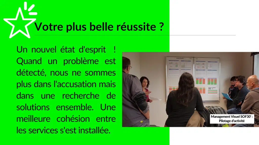 Dès le départ, l’état d’esprit a changé. Les équipes opérationnelles qui comptaient sur leur hiérarchie pour améliorer des situations ou des problèmes, ont pris conscience qu’elles étaient en capacité de proposer des idées ou des pistes d’amélioration tout aussi efficaces voire plus ! Le personnel est ainsi devenu acteur dans l’amélioration continue.
