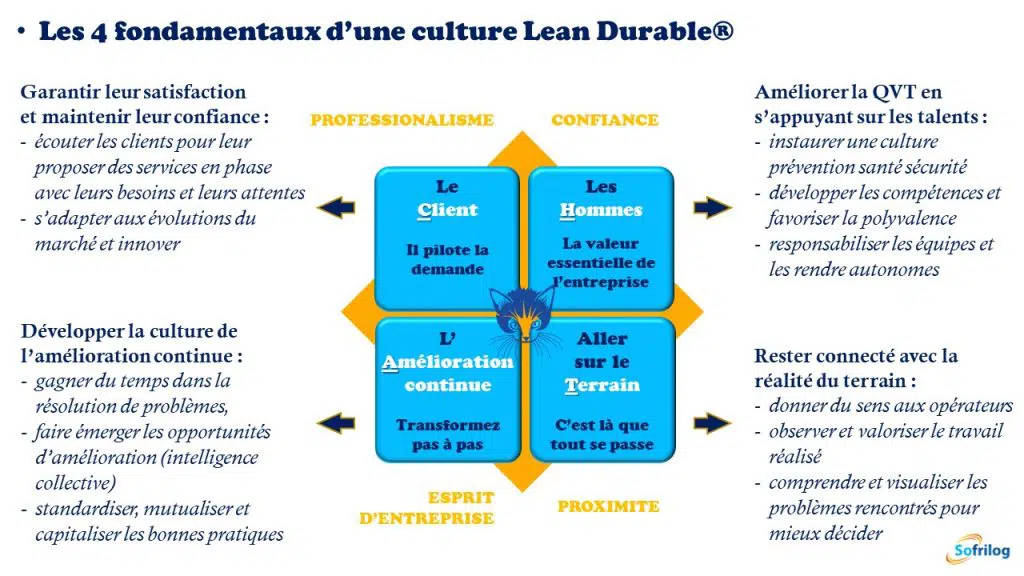 La démarche Lean Durable®, décrite par le C.H.A.T est en adéquation avec les 4 valeurs historiques du Groupe SOFRILOG :