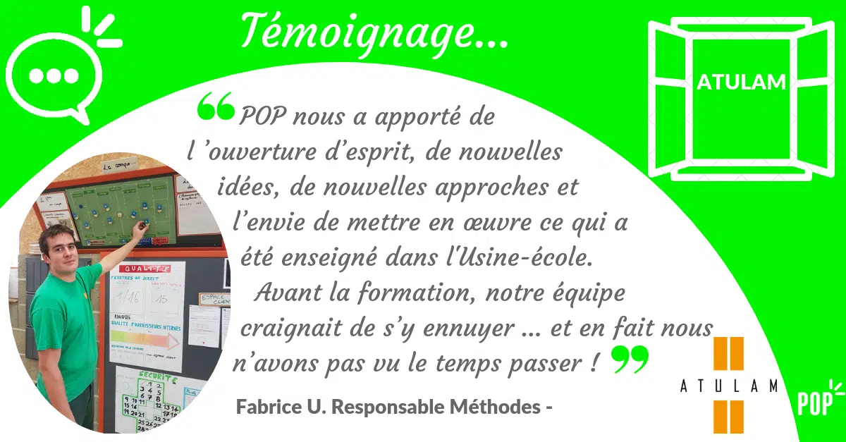 ATULAM, basé en Creuse (23) ,reconnu notamment à travers la marque « « La Fenêtre Française », est fabricant de porte et fenêtre haut de gamme et sur-mesure en bois, pour les professionnels. Accompagnée par POP depuis 2018, l’entreprise a notamment formé ses équipes managériales au Lean Durable® et mis en place le Management Visuel dans son atelier.